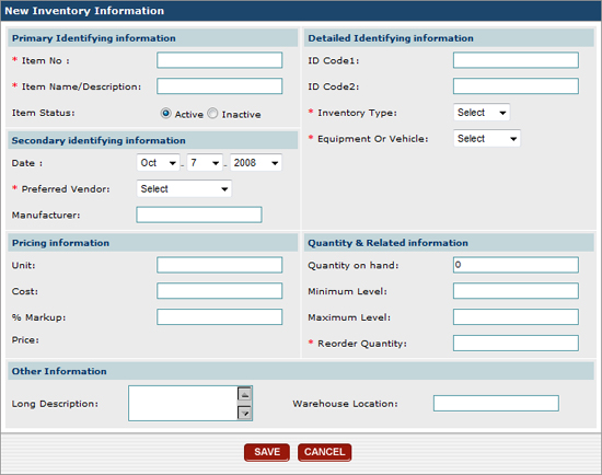 the screen where you enter all of the information for the inventory item.